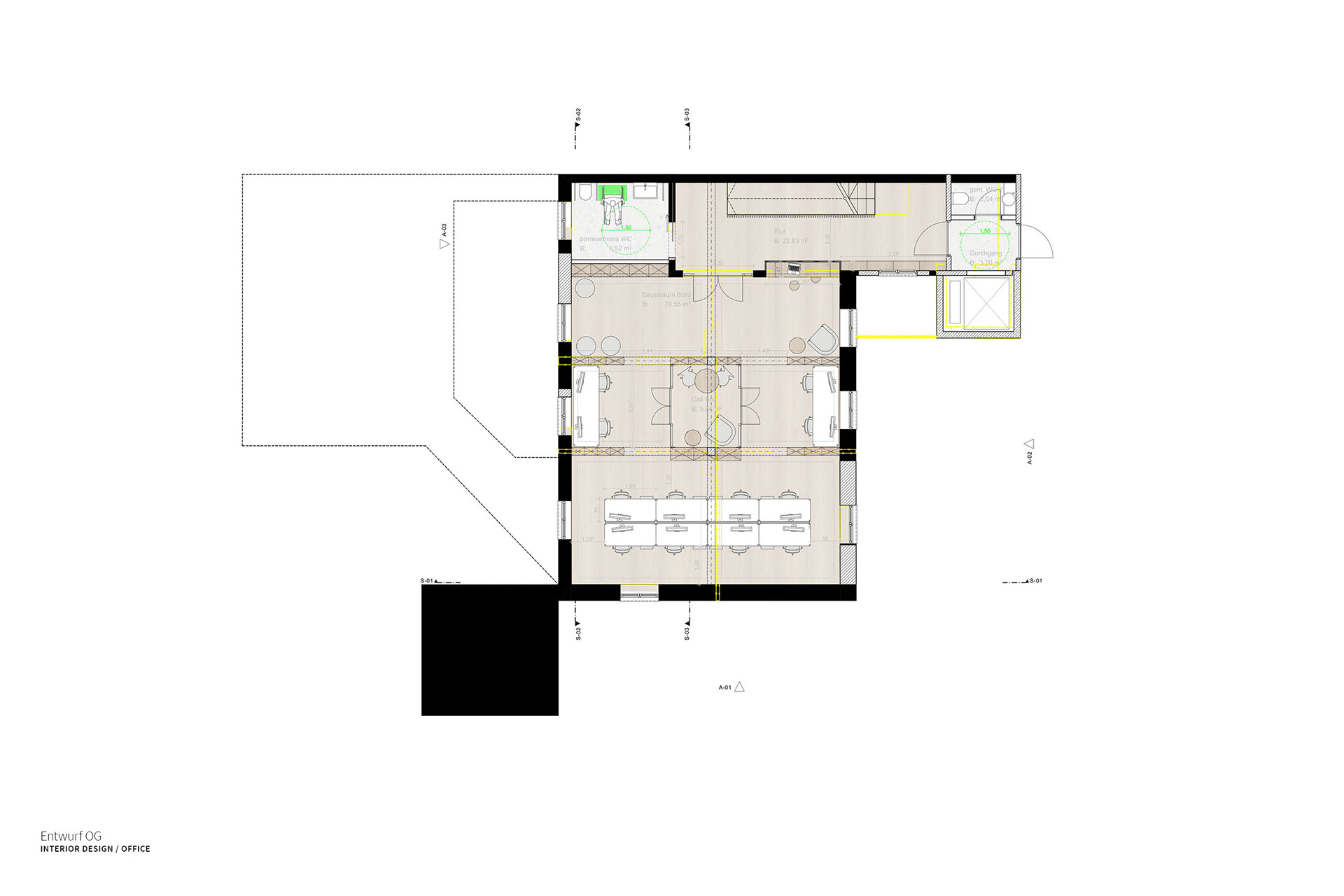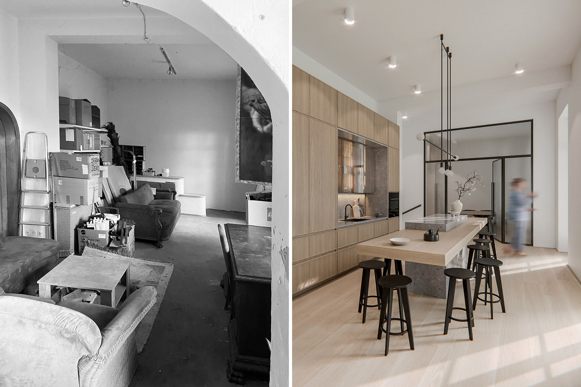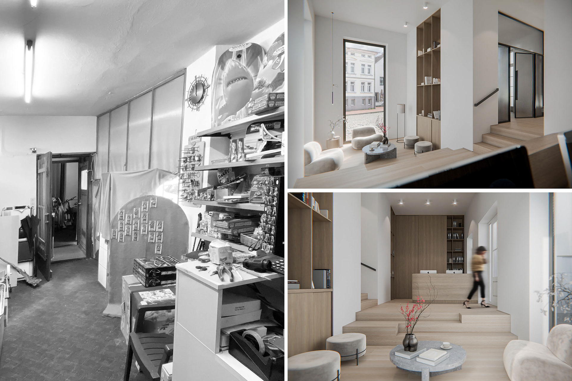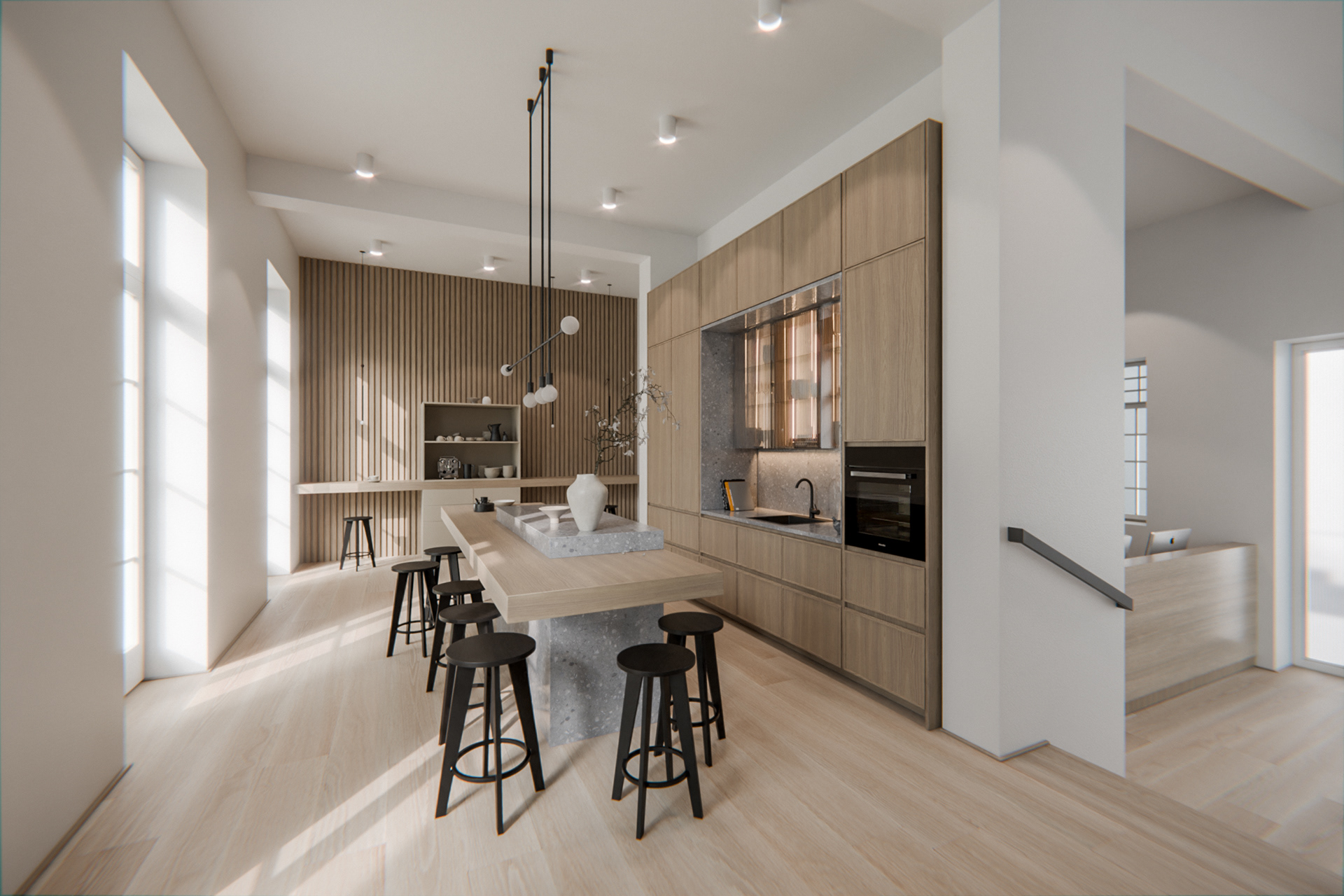 In this final design, I converted the building into the new, modern headquarters of a medium-sized design agency in the trendy Japanese-Scandinavian style. The floor plan was tidied up and a new open and functional spatial sequence was created. Here, work was always carried out in the former basic structure of the existing building and the special features such as the ceilings, which were up to 5 meters high, were highlighted. In addition to creating design sketches and plans, as a 3D nerd, I naturally focused on high-quality visualizations at the end, thereby validating and finalizing my idea and concept.